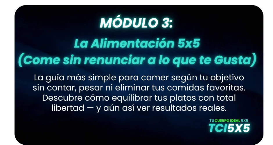 No. TCI 5X5 no requiere dietas ni restricciones. Te enseña a comer con equilibrio, sin contar, pesar ni prohibir e incluye guías prácticas y visuales para disfrutar tus comidas favoritas mientras ves resultados reales.